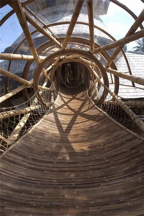 別墅的入口經(jīng)過(guò)一個(gè)非常具有戲劇性的隧道連橋,之后直接進(jìn)入到露天起居室及餐廳。戲劇性的空間讓它可以稱得上為一座奇幻主題樂(lè)園。